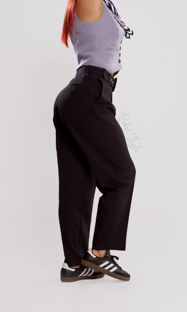 La pretina ancha con pasadores y doble botón añade un toque estructurado y moderno, reforzando su carácter versátil. Incluye bolsillos delanteros funcionales, siempre prácticos, y está confeccionado en una tela con caída elegante que garantiza un acabado pulido en cualquier ocasión.