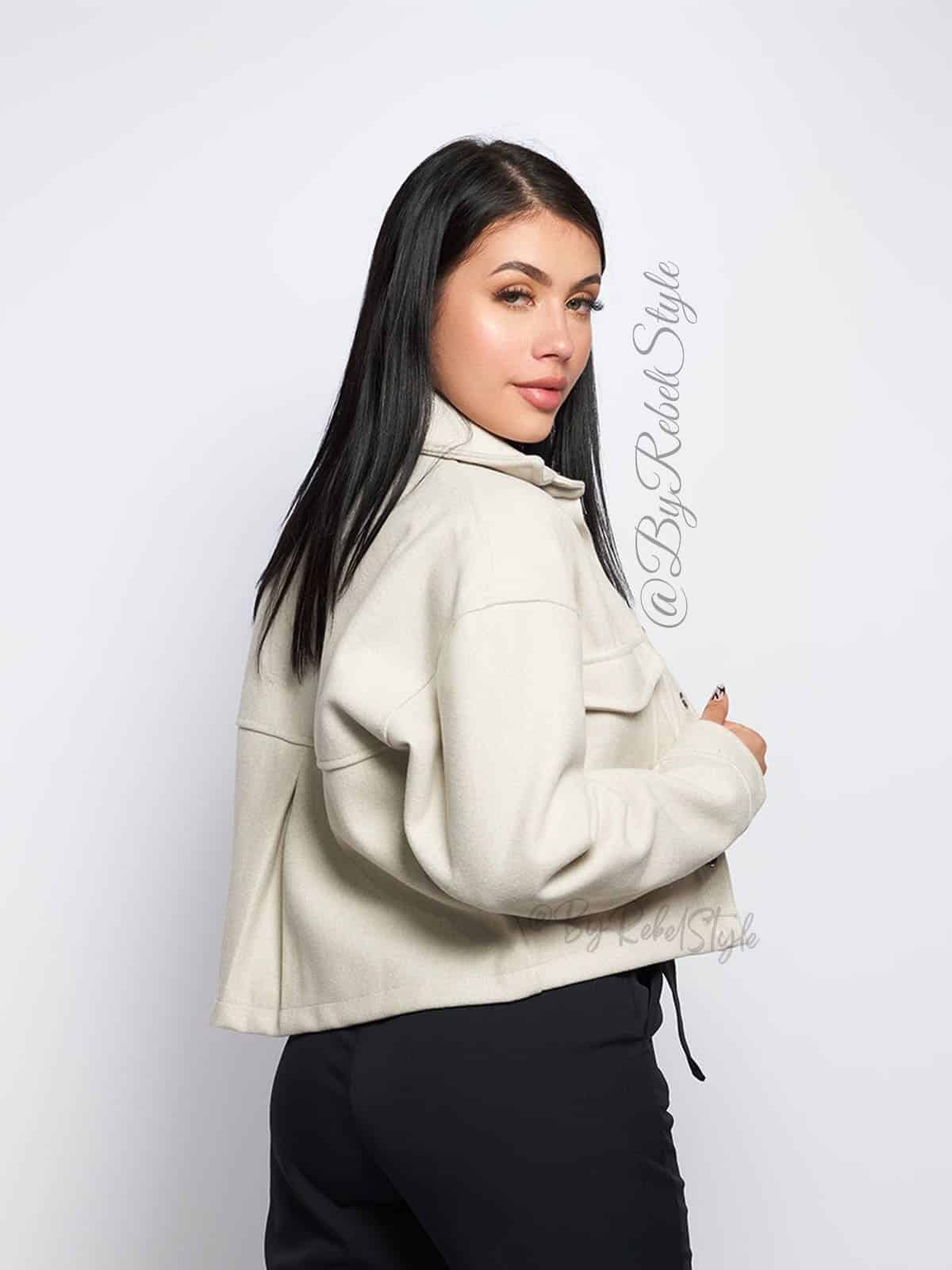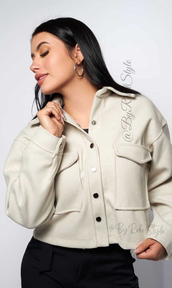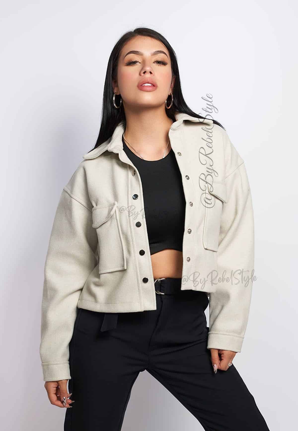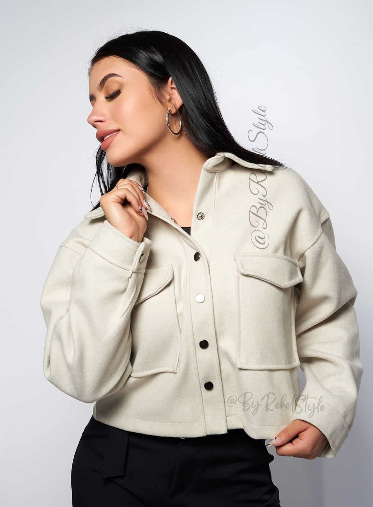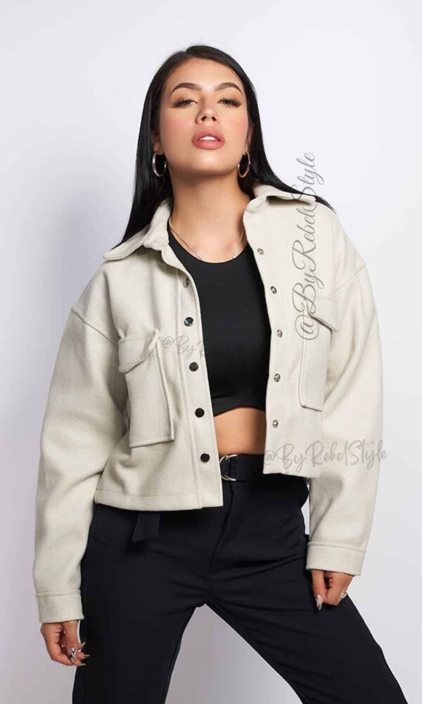 La chaqueta May es perfecta para un look casual con estilo. Confeccionada en tela de alta calidad, cuenta con un diseño corto y moderno, bolsillos frontales grandes que añaden un toque práctico, y botones metálicos que realzan su apariencia. Disponible en tonos gris, marfil y negro, esta prenda es versátil para combinar con diferentes atuendos, brindando comodidad y elegancia a cualquier look diario o semiformal. Material: Paño grueso. Detalles adicionales: Botones de broche. Nuestra modelo mide 1,68 y usa la chaqueta May en talla S