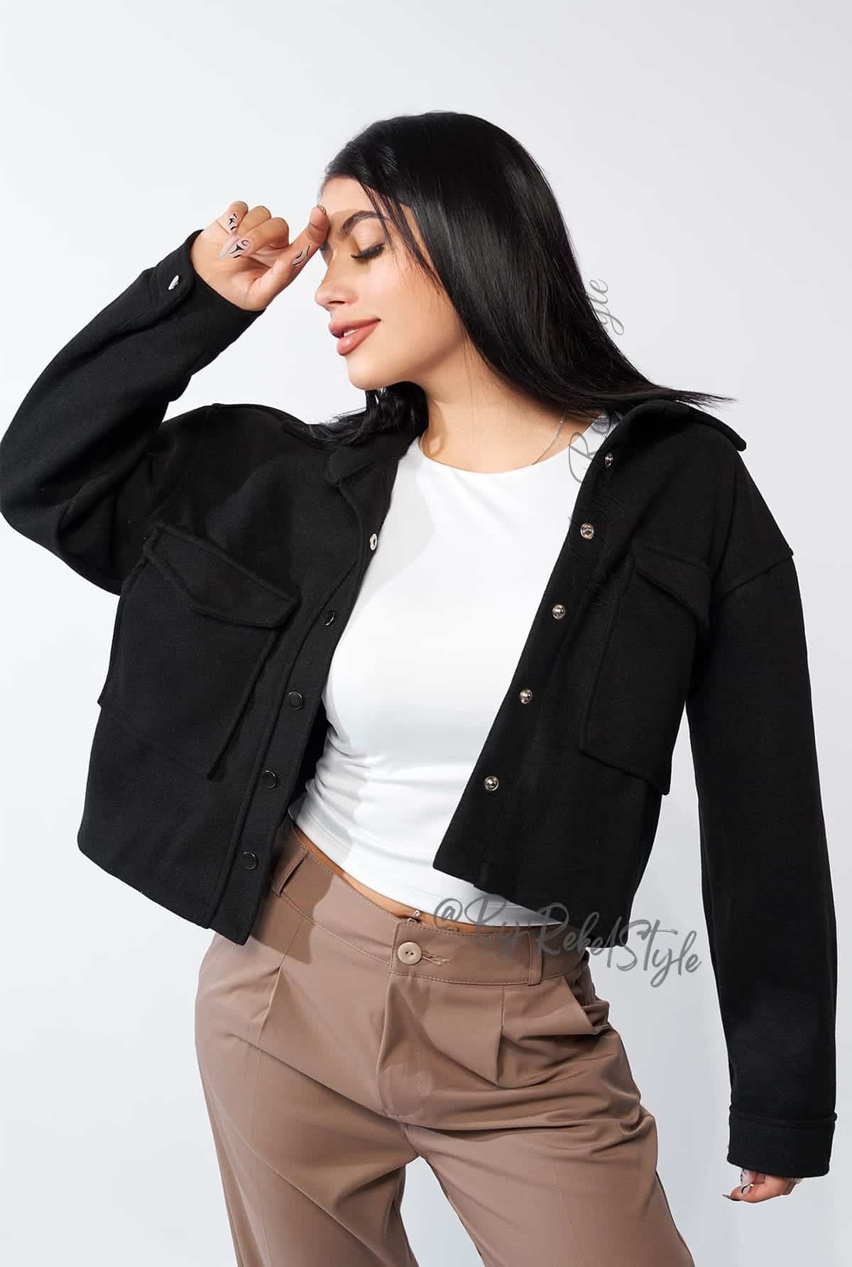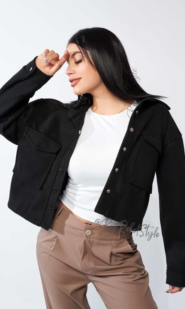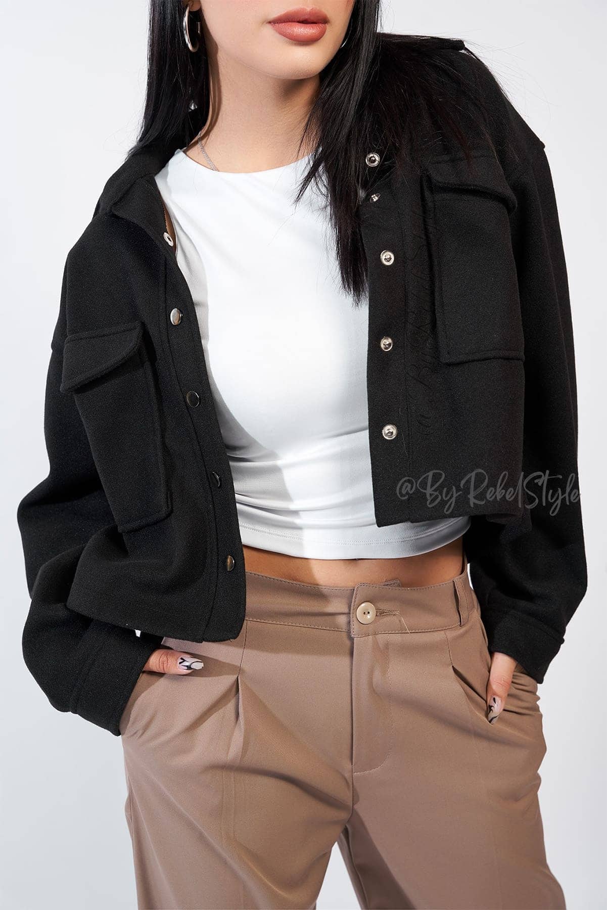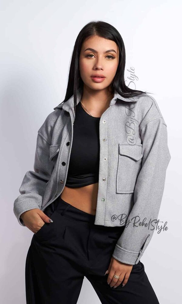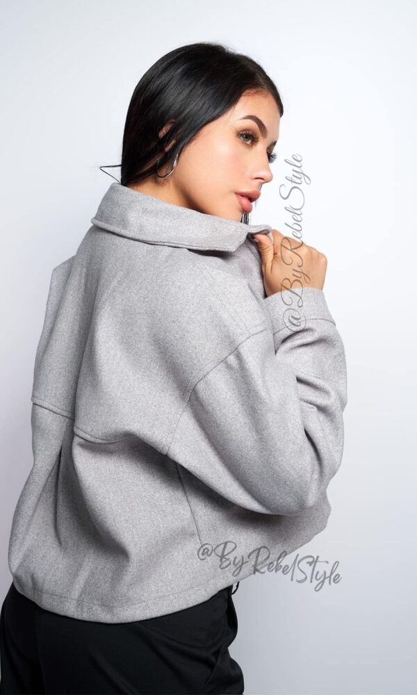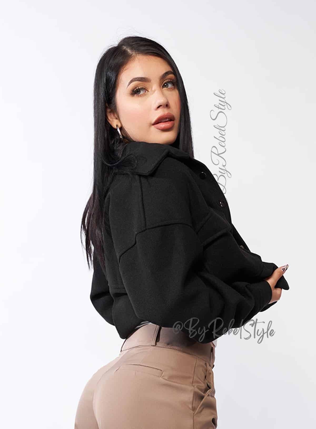 La chaqueta May es perfecta para un look casual con estilo. Confeccionada en tela de alta calidad, cuenta con un diseño corto y moderno, bolsillos frontales grandes que añaden un toque práctico, y botones metálicos que realzan su apariencia. Disponible en tonos gris, marfil y negro, esta prenda es versátil para combinar con diferentes atuendos, brindando comodidad y elegancia a cualquier look diario o semiformal. Material: Paño grueso. Detalles adicionales: Botones de broche. Nuestra modelo mide 1,68 y usa la chaqueta May en talla S